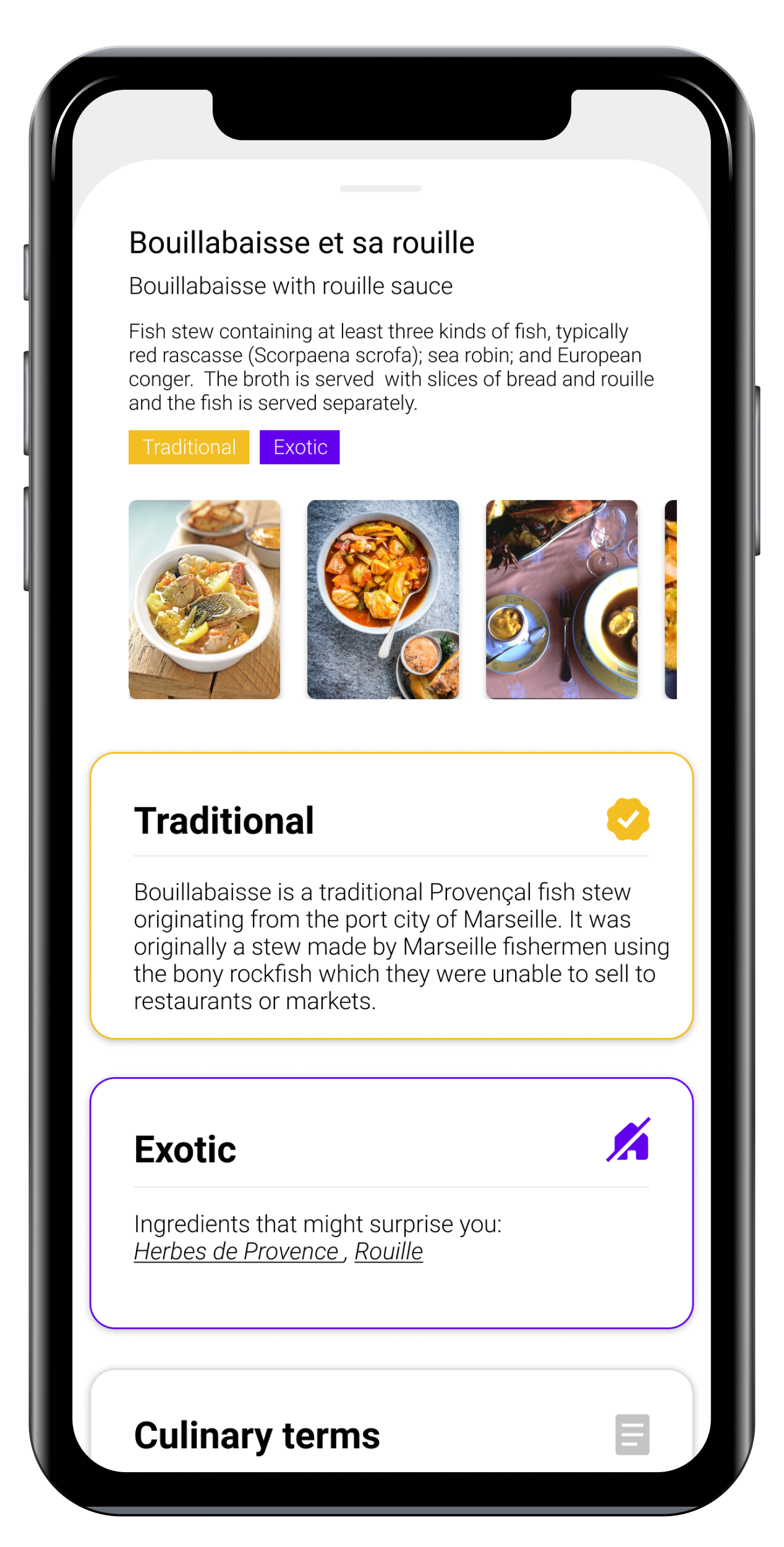 Dish Categories: Indicates whether a dish is considered traditional, exotic, or similar to the user’s home cuisine, helping diners navigate their culinary preferences and comfort levels. It describes the rationale for this categorisation.